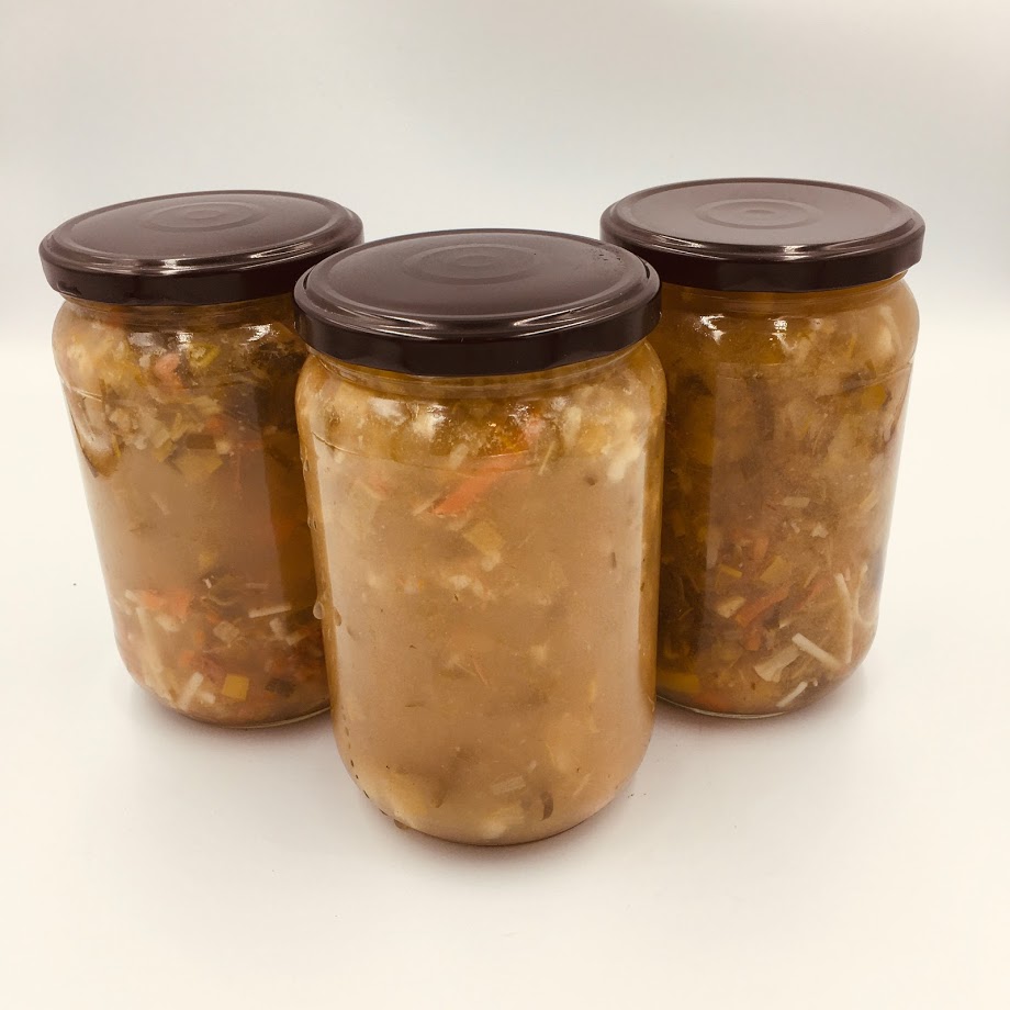 Ingredienten: water, prei, selderij (selderij), winterpeen, bloemkool, rundvlees, gehaktballetjes (varkens- en rundvlees), glutenvrije vermicelli (maïsmeel, rijstemeel), zout, peper, nootmuskaat, foelie, kurkuma en kruidnagel