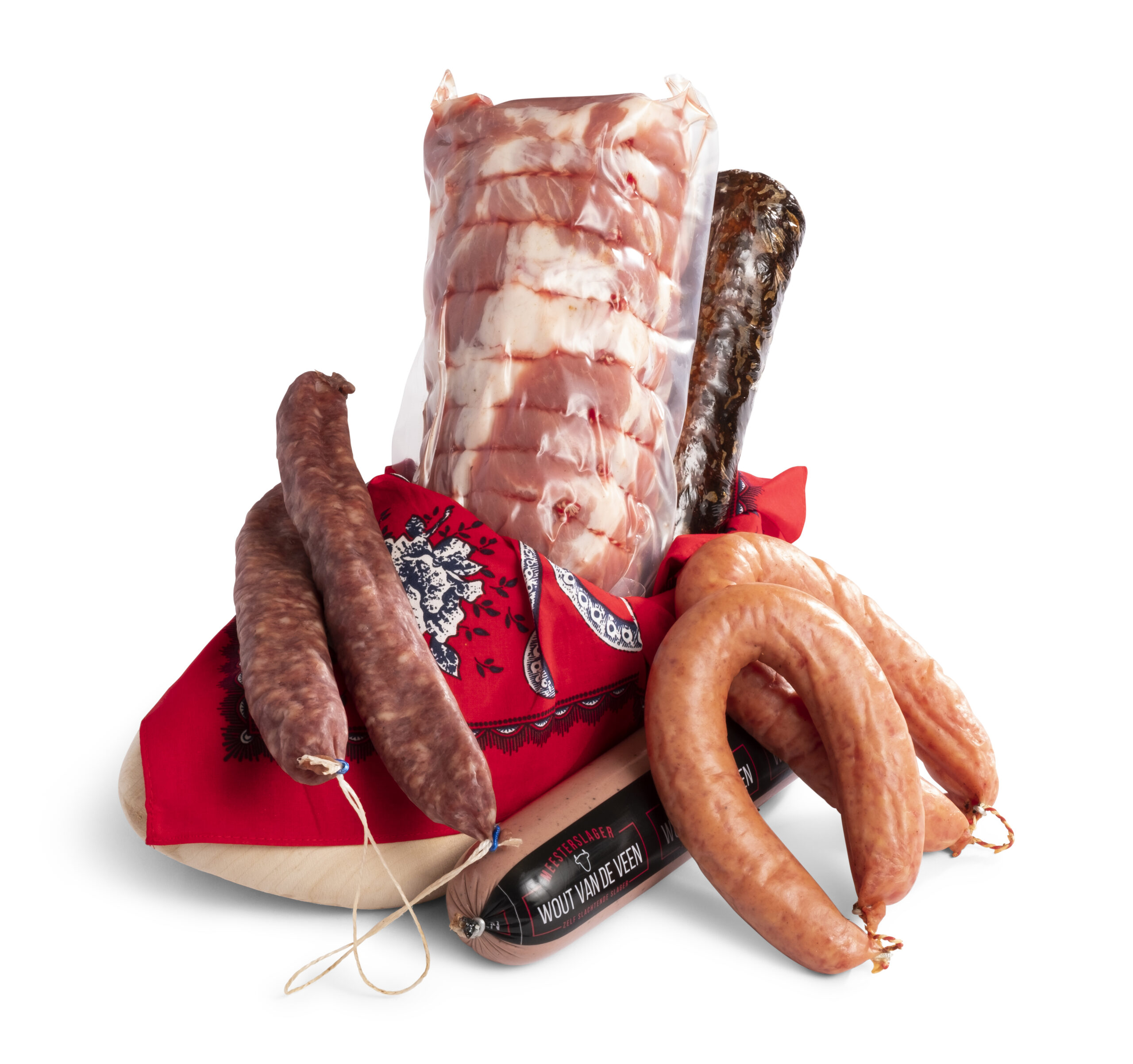 Klomp met rode zakdoek gevuld met: Schouderfiletrollade á 1 kilo, Hele grillworst, Hele leverworst, 2 x Rookworst, 2 x Droge worst