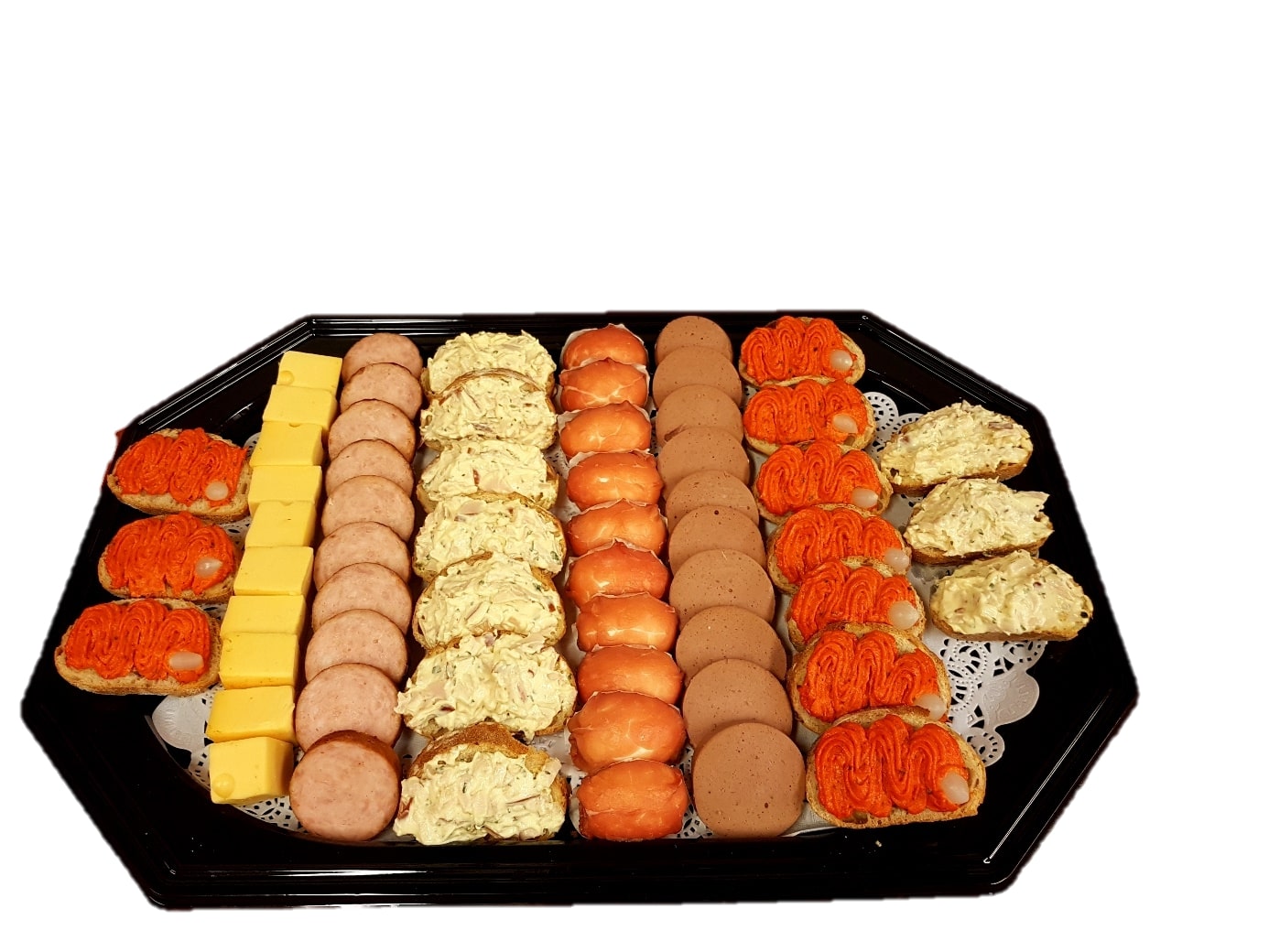 Koude hapjes à 60 stuks per schaal bestaande uit: Stokbrood met filet american, Jong belegen kaas blokjes, Stokbrood met gerookte kipsalade, Grillworst, Rookvlees met ei en Fijne leverworst.