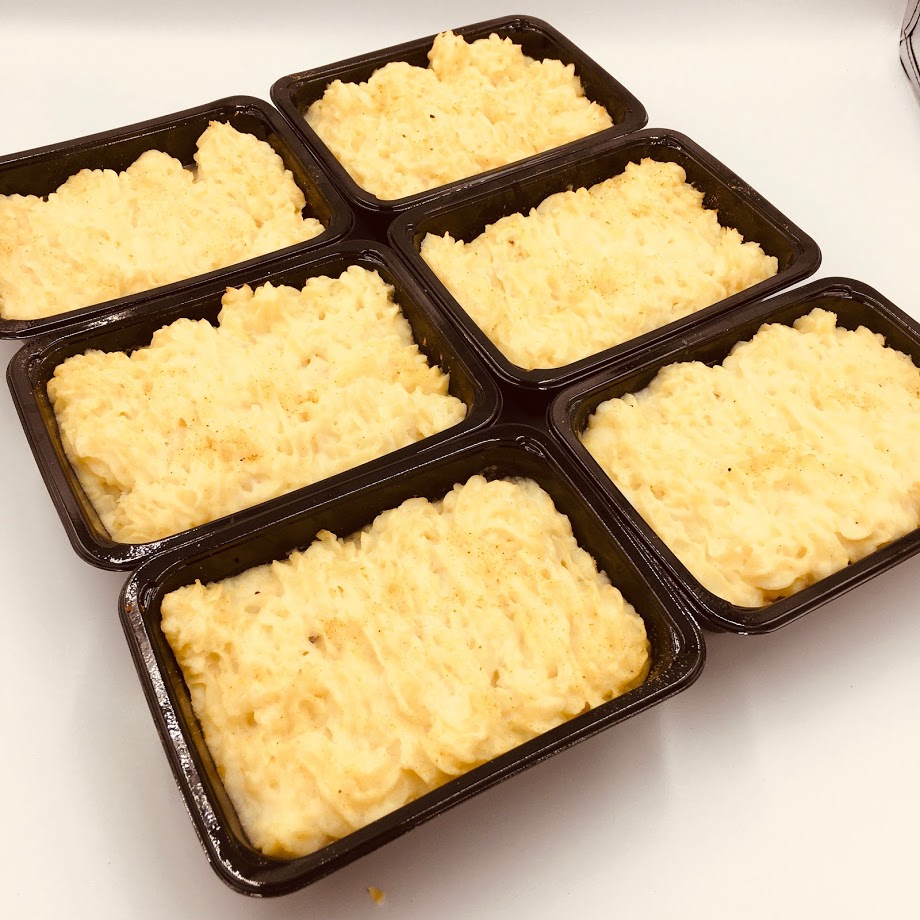 Witlofrolletjes met ham, kaas, kaassaus en aardappelpuree. Even opwarmen in de magnetron. Maaltijd voor 1 persoon (500 gram).